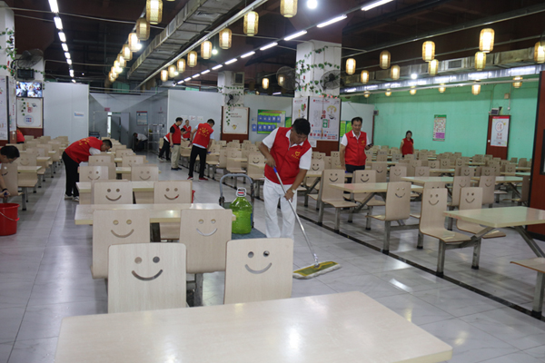 首先進行的是公司食堂的清掃清潔。只見志愿者們有的手持抹布,有的揮舞拖把,有的幫忙換水,大家團結協作分工有序埋頭苦干,對食堂的打菜窗口、桌椅板凳、地面墻角等處進行深入清掃,做到不留衛生死角。通過辛勤勞動,食堂的環境衛生狀況得到改善,面貌煥然一新。